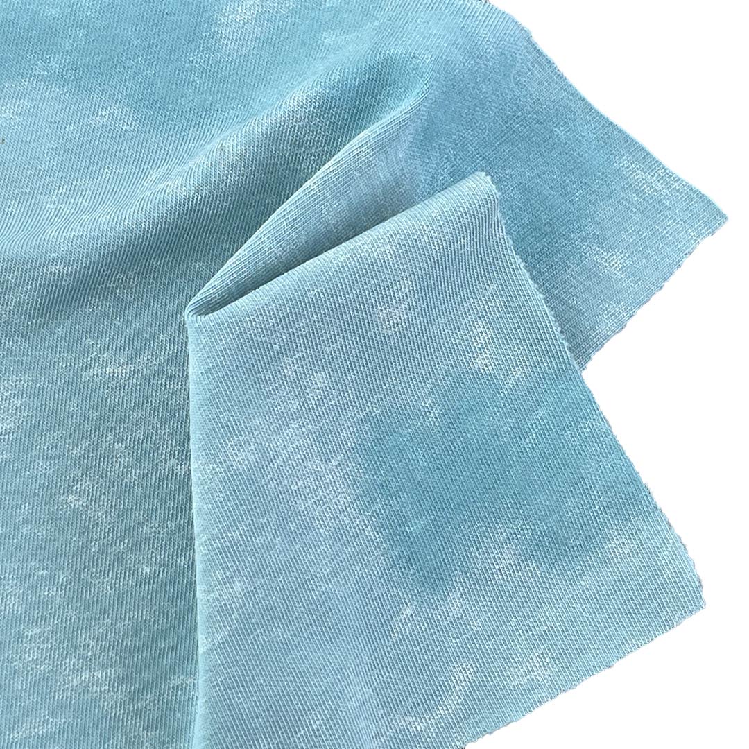 Embrace the effortless cool of street style with our 120gsm Acid Wash Single Jersey Fabric, expertly crafted from 95% Cotton and 5% Spandex. This ultra-lightweight fabric undergoes a specialized acid wash treatment that creates a beautifully marbled, textured surface, giving each garment a vintage-inspired grit that captures the essence of urban fashion.