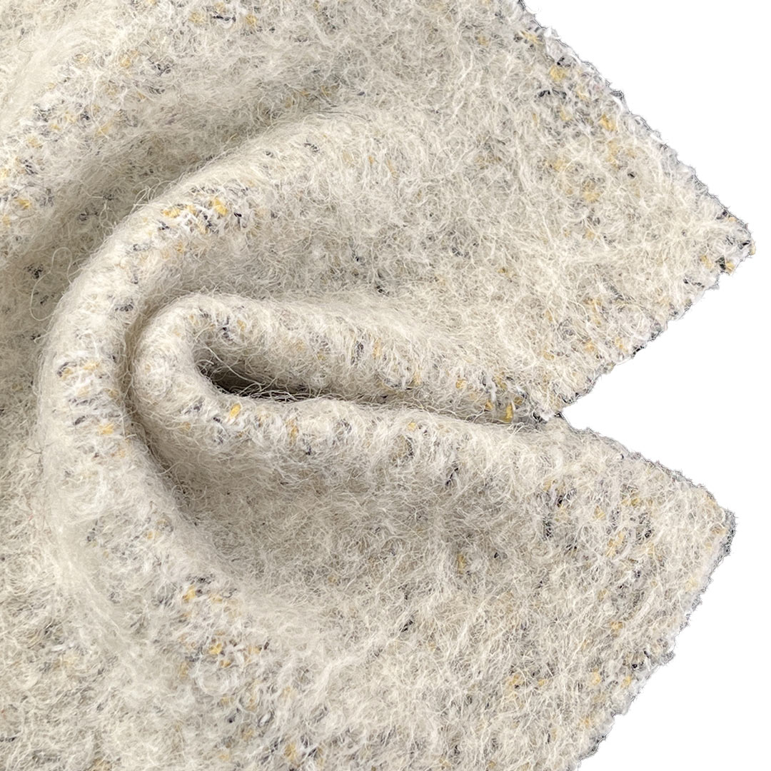 Experience the ultimate in cozy luxury with our 610gsm Boucle Fabric, expertly crafted from 48% Polyester, 7% Acrylic, and 45% Wool. This ultra-heavyweight fabric features a rich, looped surface that creates a sumptuous tactile experience and striking visual depth, making it ideal for statement sweaters, artistic tapestries, plush blankets, and indulgent pajamas.