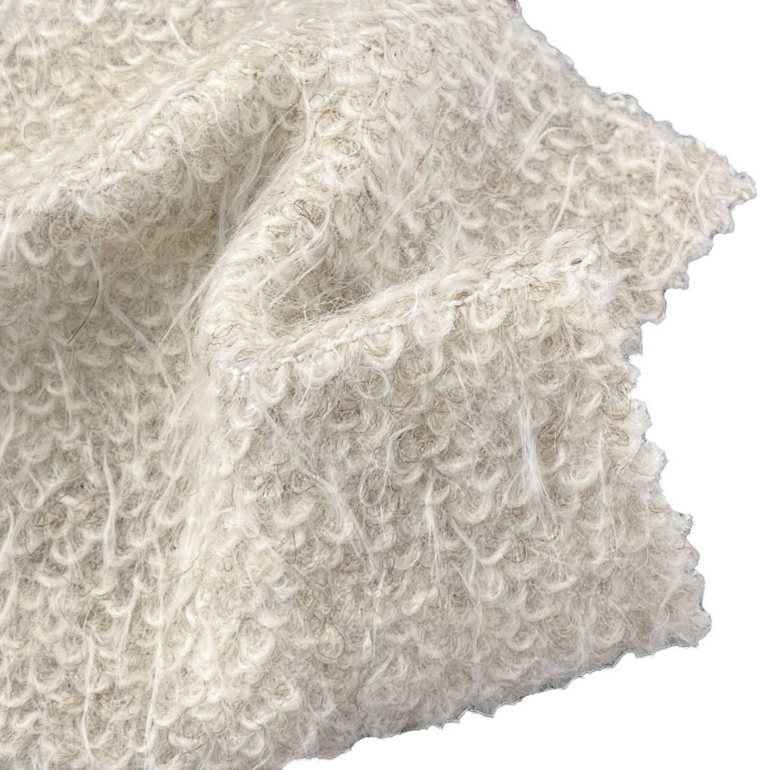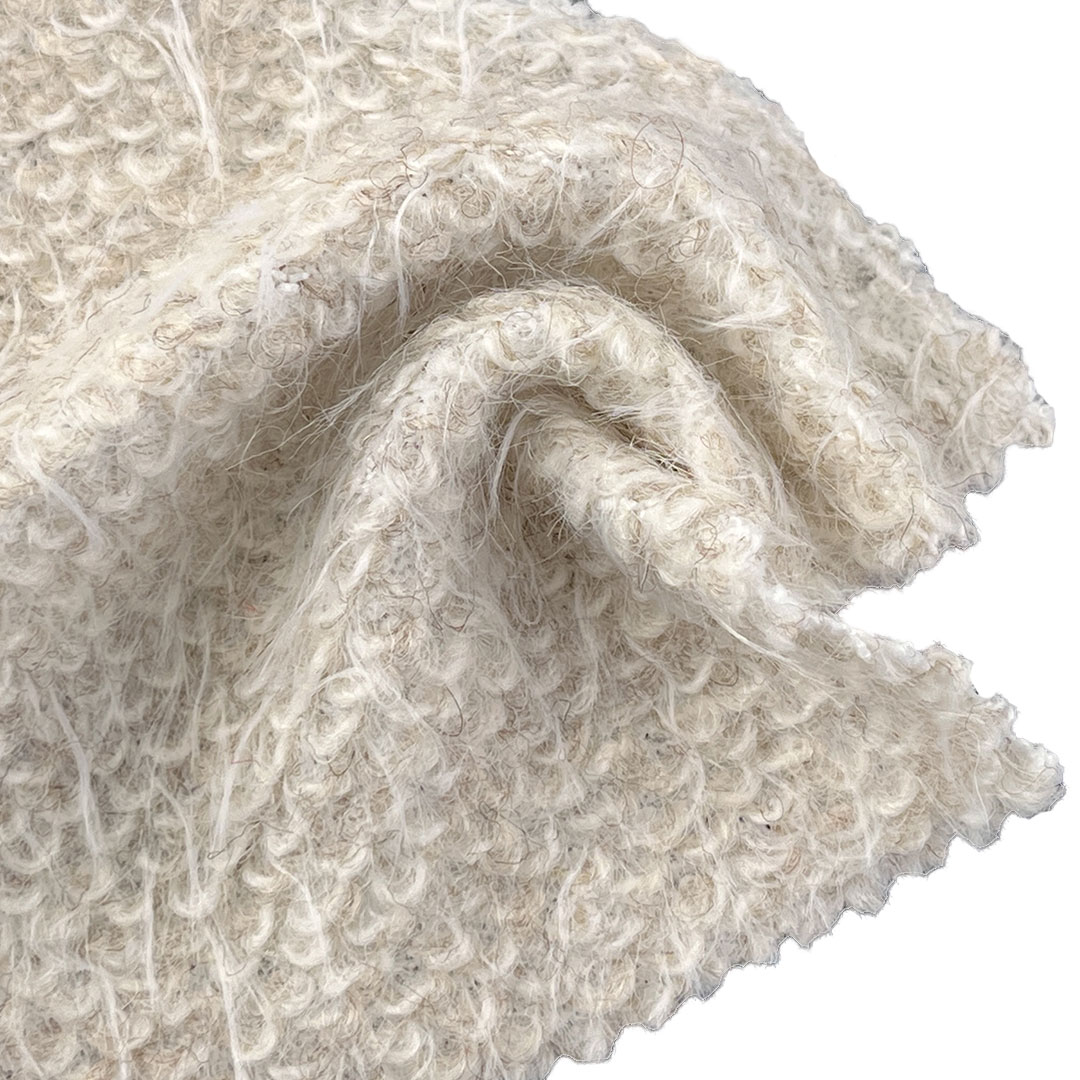 Weighing 680gsm, this substantial fabric delivers maximum warmth and structural presence, making it ideal for cozy sweaters and statement jackets designed for harsh winter conditions. The plush surface feels gentle against the skin, while the boucle loops create a rich, dimensional effect that catches light and adds character to any garment. Despite its weight, the fabric maintains a graceful drape, allowing for tailored silhouettes in jackets and comfortable fits in sweaters. Easy to care for with proper handling, this boucle fabric retains its vibrant colors, intricate texture, and plush softness over time.