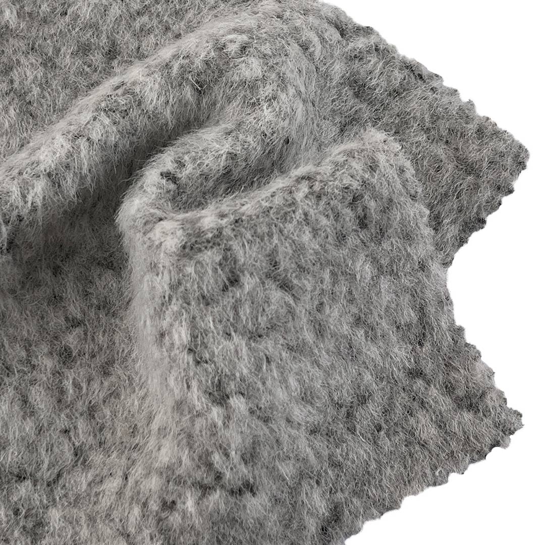 The wool content provides natural insulation, breathability, and a soft hand feel, while the polyester enhances strength, shape retention, and resistance to wrinkles and pilling. Weighing 700gsm, this substantial fabric offers exceptional warmth and a luxurious, plush texture, perfect for both decorative and wearable applications. The boucle loops not only add aesthetic character but also improve thermal retention by trapping air within the textured surface. Its versatile nature allows for creative expression in home decor as elegant wall hangings or in fashion as statement zip-up hoodies and indulgent loungewear.