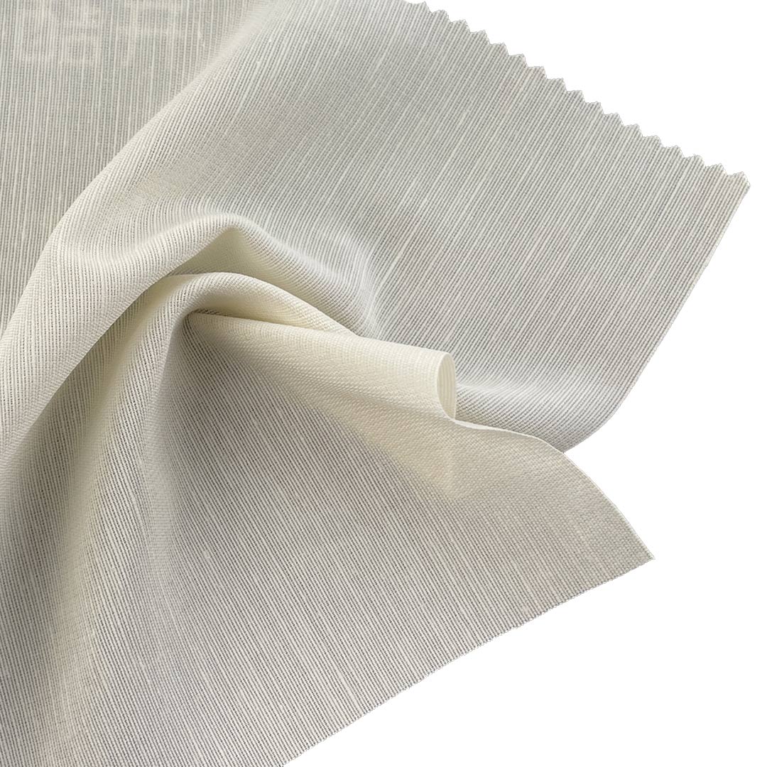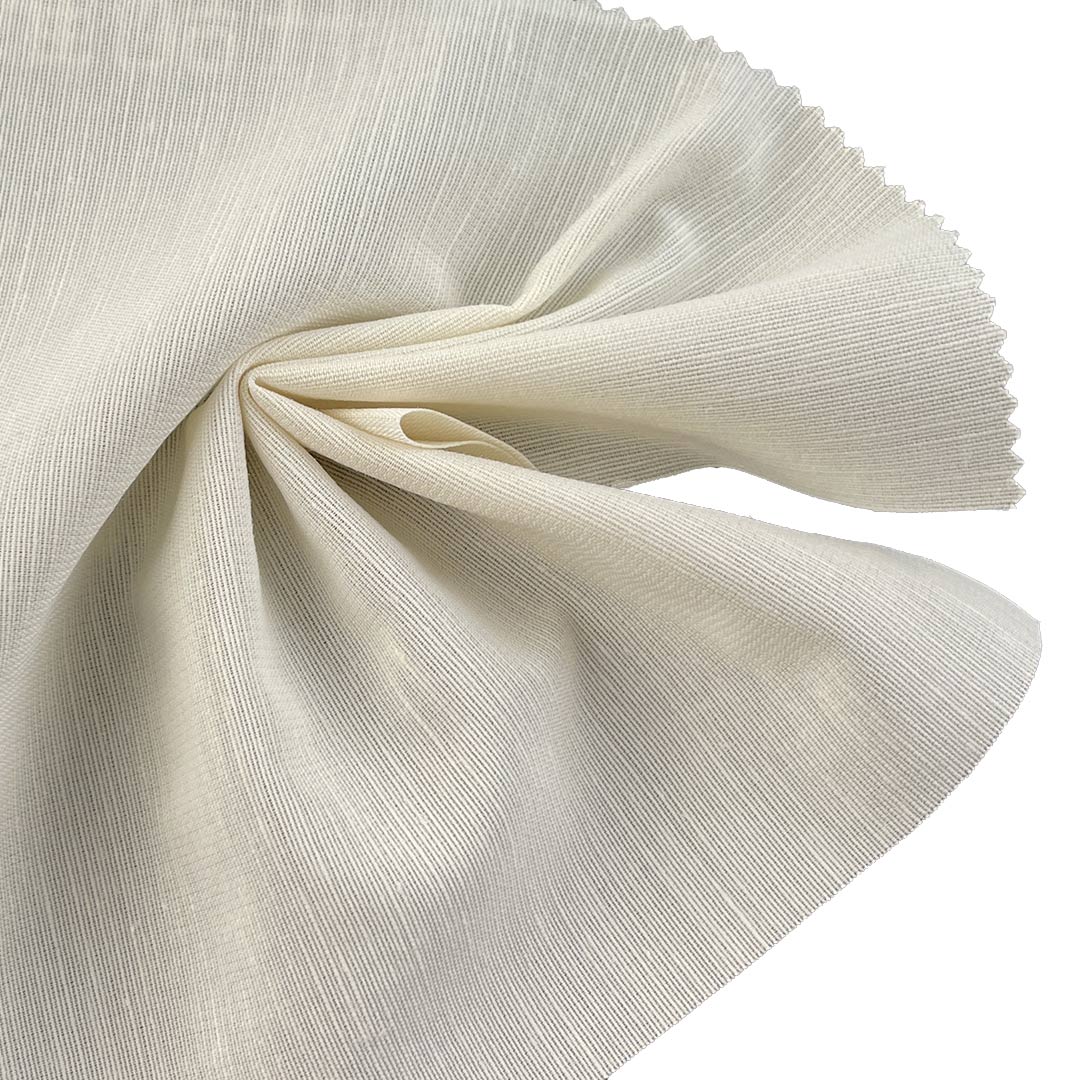 Cotton provides breathability, softness, and comfort, polyester ensures durability, wrinkle resistance, and shape retention, while linen adds natural texture, rustic character, and enhanced breathability. Weighing 140gsm, this fabric offers a polished drape with a balanced structure, perfect for structured garments like trench coats and tailored shirts, as well as supportive inner linings for suits and outerwear that combine elegance with durability. The smooth surface and crisp texture allow garments to maintain a clean, professional appearance with a touch of natural texture. Perfect for creating smooth interlining fabric and crisp suit lining material, this fabric is equally effective in elegant dresses and functional inner layers. Easy to care for and machine washable, this cotton-polyester-linen cambric textile retains its luxurious finish, vibrant colors, and structural integrity over time.