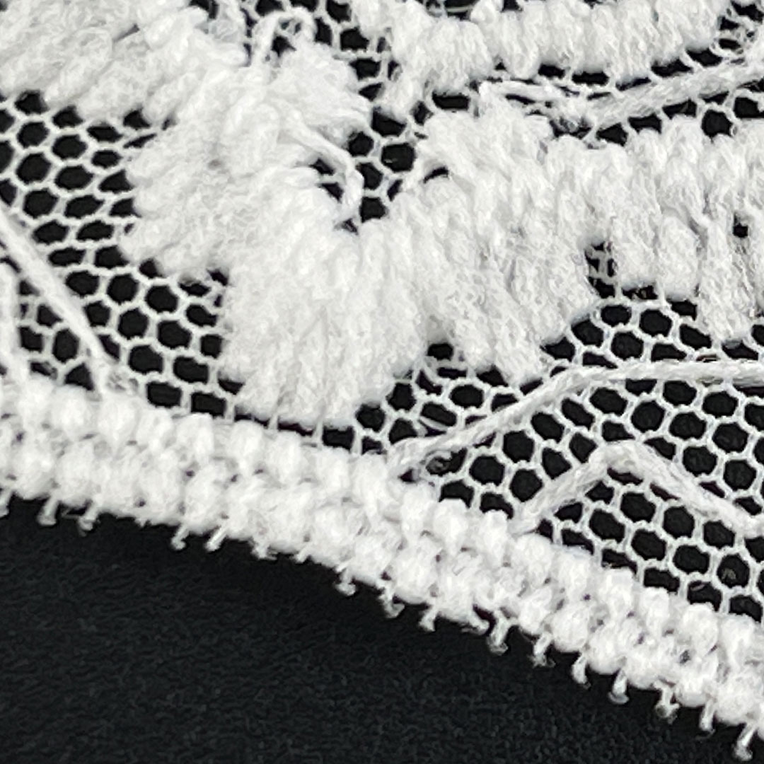 The transparent mesh construction ensures excellent airflow, making it ideal for layered designs or standalone pieces in warmer climates. Its delicate yet durable structure allows for beautiful drape and movement, enhancing the silhouette of any design. The intricate lace details create visual interest and texture, while the sheer quality adds a subtle allure to garments. Easy to work with and versatile in application, this fabric can be used as a primary material or as an elegant accent in apparel accessories.