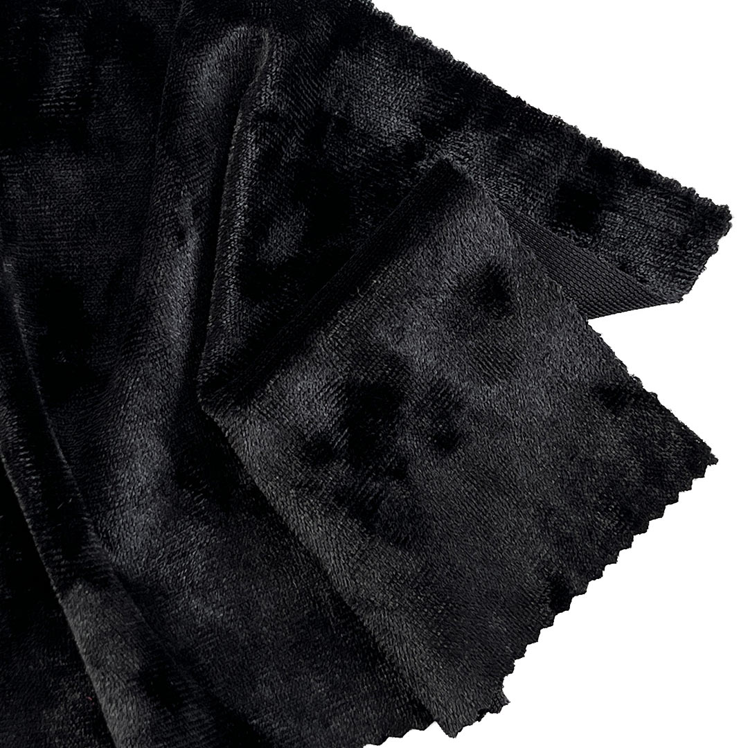 Weighing 260gsm, this medium-weight fabric drapes beautifully and offers a soft, plush embrace, making it perfect for skirts that demand a touch of glamour and evening gowns that require both opulent visual appeal and wearable comfort. Its plush texture feels indulgent against the skin and lends a lavish, sophisticated aesthetic to both casual-chic and formal ensembles. The crushed effect creates a captivating play of light and shadow across the surface, adding visual depth, texture, and a touch of vintage allure. Easy to care for and machine washable, this fabric retains its velvety pile, rich colors, and elegant character over time.