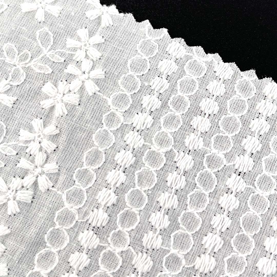 Crafted entirely from 100% premium natural cotton, our Eyelet Fabric represents the perfect synthesis of textile artistry and functional design. This Fine Cotton Fabric features intricate eyelet embroidery—a meticulous technique that creates delicate patterned perforations across the surface—resulting in a Textured Embroidered Cloth with remarkable visual depth, tactile richness, and a breathable openwork structure ideal for warm-weather garments. The fabric’s Breathable Cotton Textile construction ensures optimal airflow, making it exceptionally suitable for a variety of apparel including dresses, Tops, skirts, and blouses that demand both style and comfort.