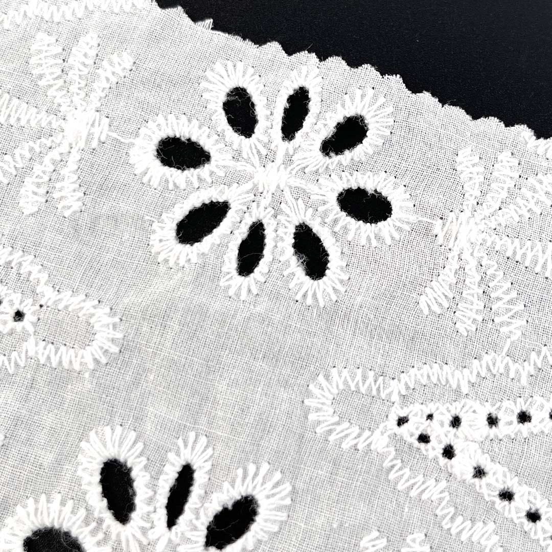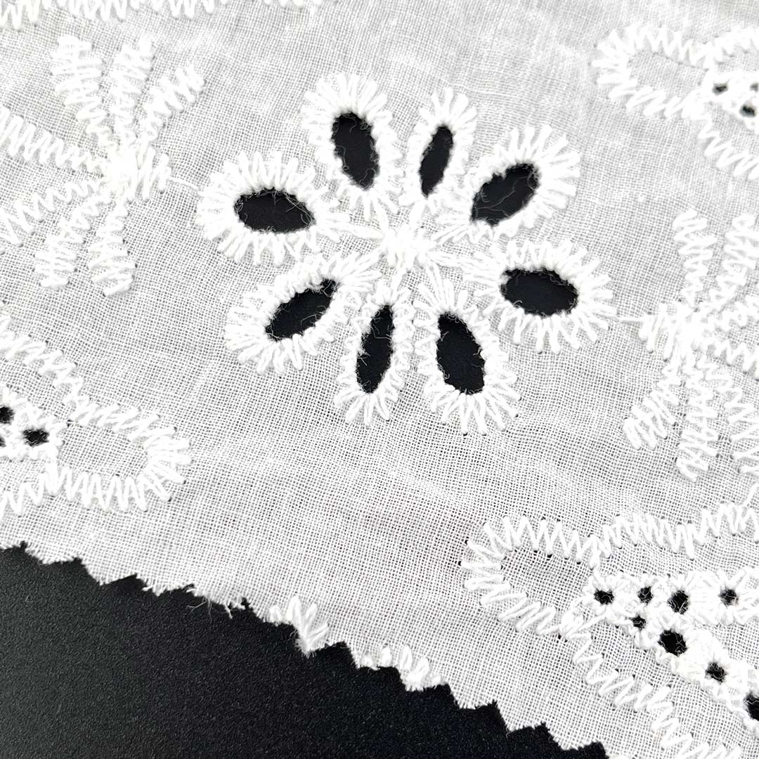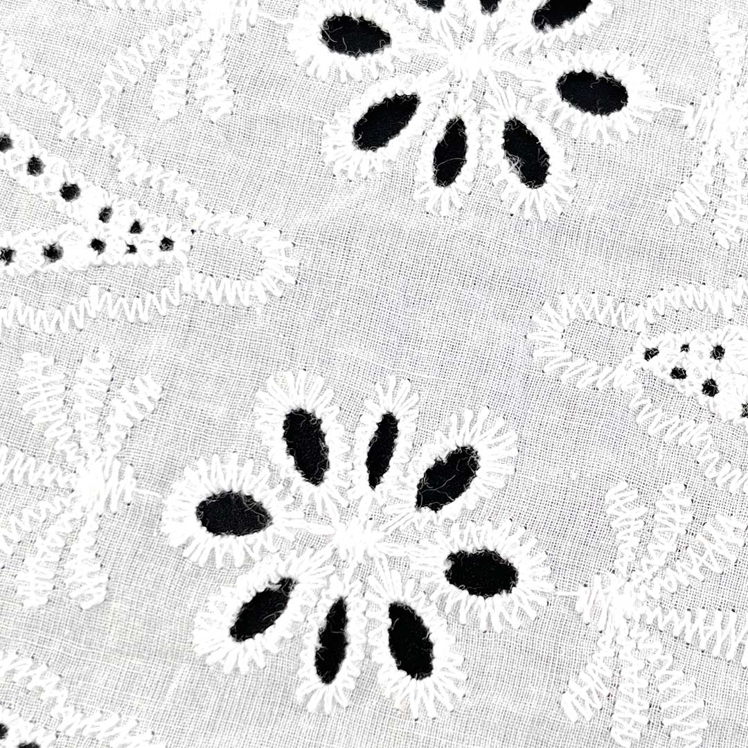 With its Soft Cotton Fabric hand feel, the material provides gentle contact against the skin, while the natural drape of high-quality cotton allows each garment to move gracefully with the wearer's form. The eyelet embroidery introduces a Delicate Embroidered Fabric elegance, making the fabric versatile enough for both casual daytime wear and refined evening attire. Whether used as Fashion Embroidered Cloth for modern Tops, as Floral Embroidered Fabric for feminine dresses, or as Bridal Lace Fabric for special occasions, this Eco-Friendly Cotton Textile aligns seamlessly with sustainable fashion values thanks to its biodegradable, natural composition.