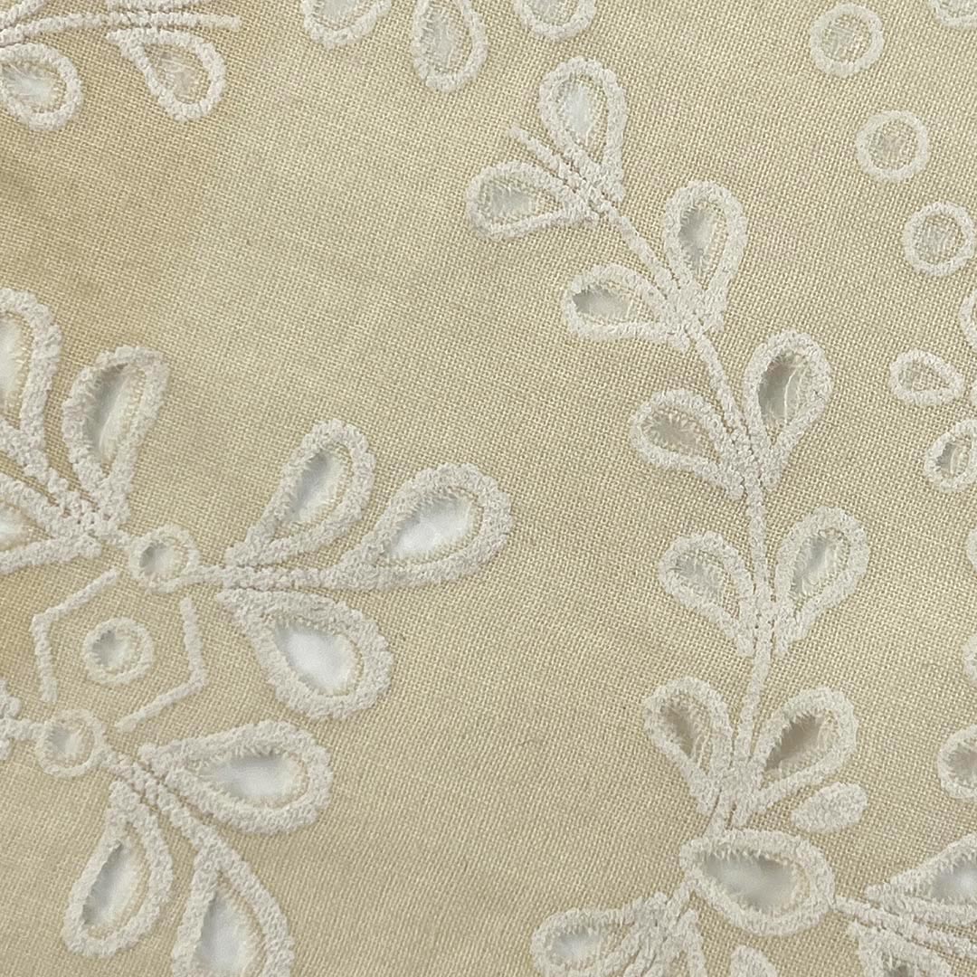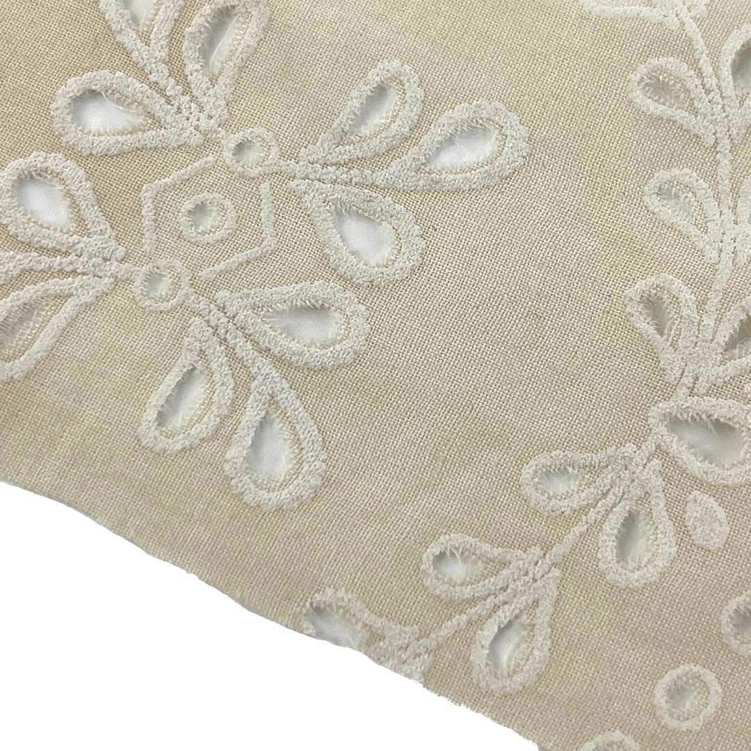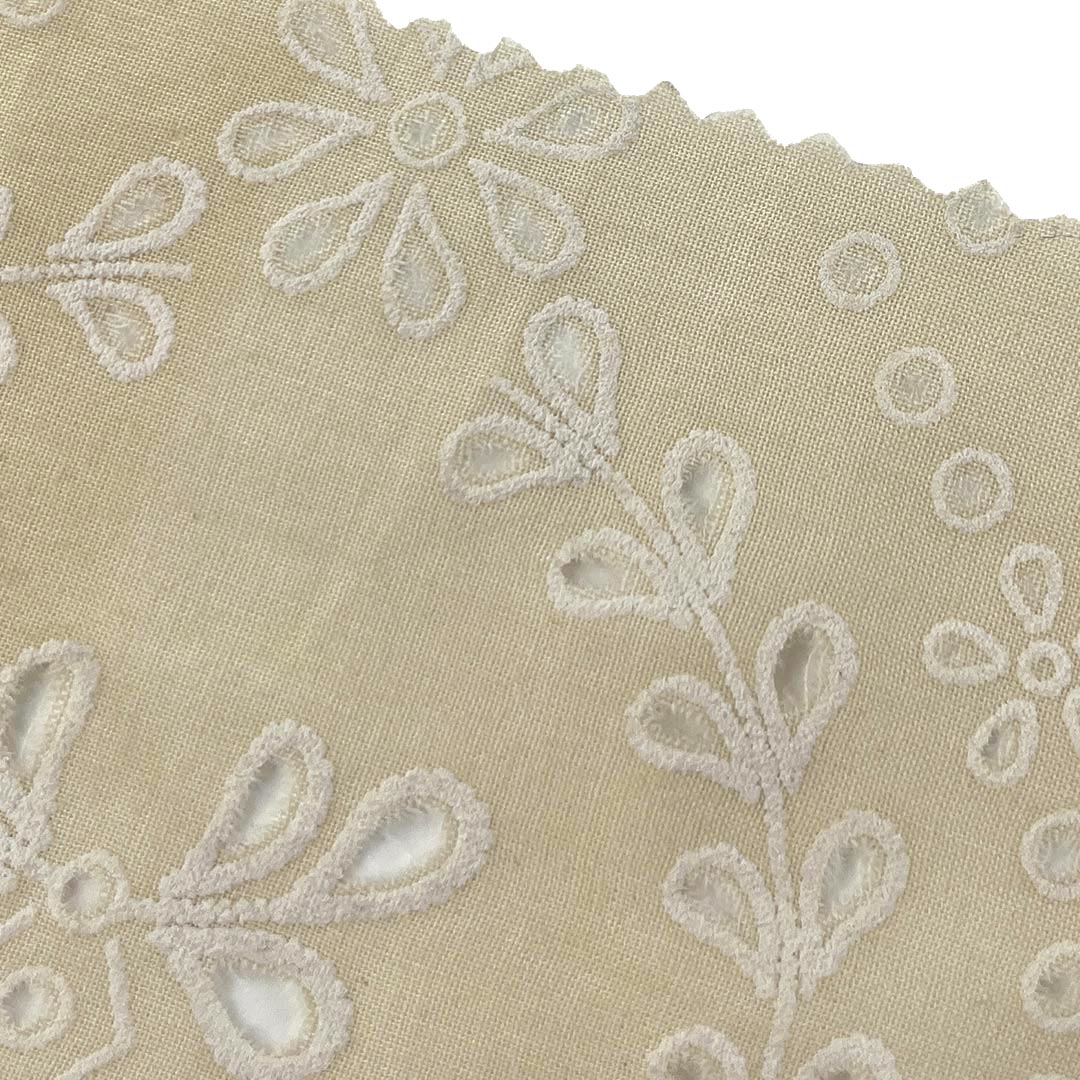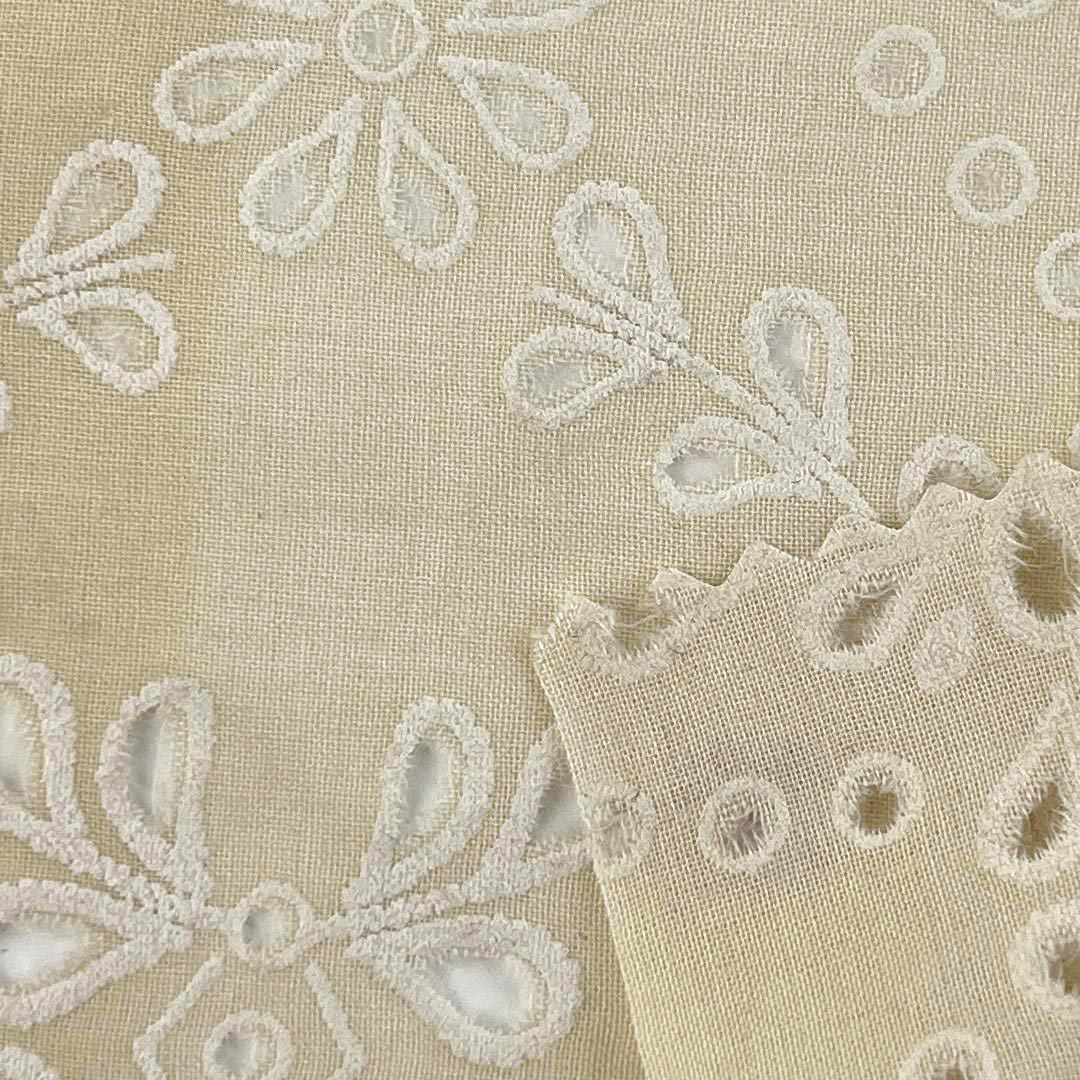 Crafted entirely from 100% premium cotton, this refined eyelet fabric offers a distinctive carved-out embroidery fabric that mimics the delicate artistry of sculpted lace, creating a breathable material with pronounced texture and dimensional appeal. The pure cotton composition ensures exceptional softness, superior moisture absorption, and gentle comfort against the skin, making it an ideal choice for sensitive wearers and extended use.