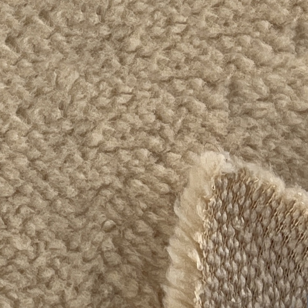 The high-pile fleece interior provides a cloud-like softness against the skin, while the sculpted outer texture adds visual depth and rustic charm. Weighing 450gsm, this substantial fabric delivers maximum warmth and coverage without excessive bulk, making it ideal for layering in freezing conditions. The polyester composition ensures durability, shape retention, and resistance to pilling, shrinking, and moisture, maintaining its plush appearance over time. The soft, brushed surface feels gentle and inviting, while the fabric's structure supports tailored silhouettes for hoodies, relaxed sweatshirts, and structured coats.